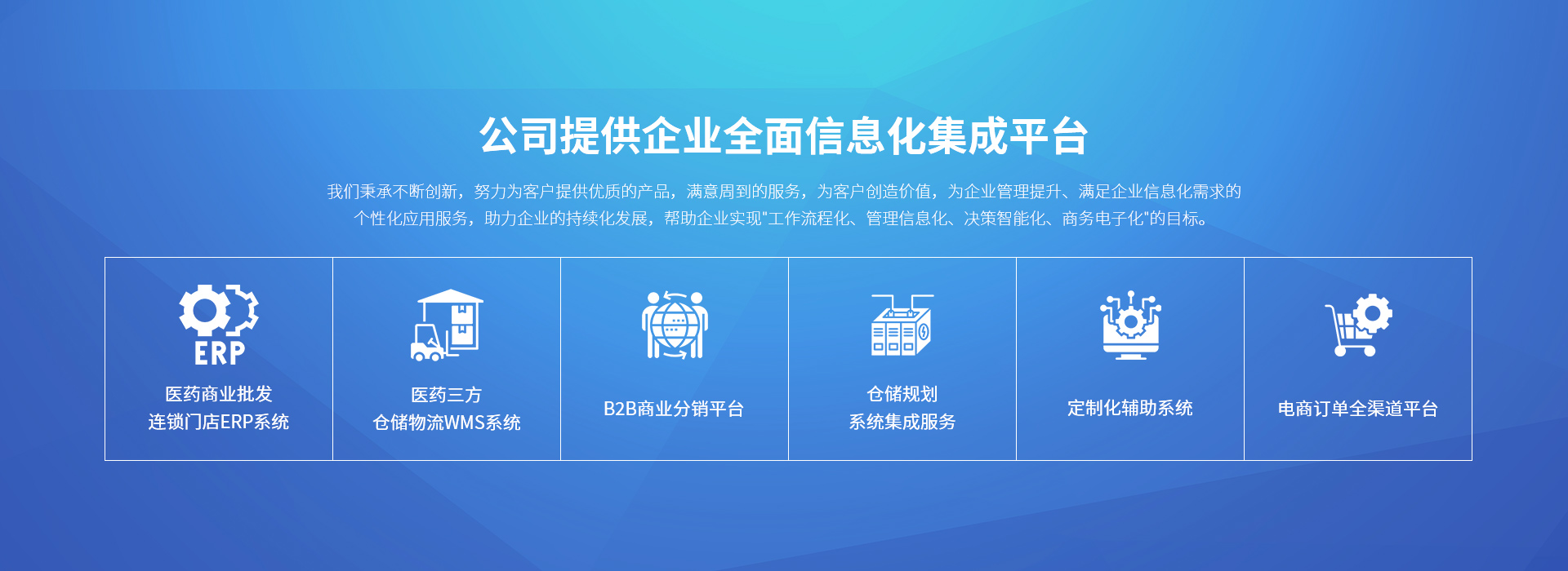 公司提供企業(yè)全面信息化集成平臺(tái),產(chǎn)品包括:ERP供應(yīng)鏈管理系統(tǒng)、WMS倉(cāng)儲(chǔ)管理系統(tǒng)、電子首營(yíng)及藥檢單平臺(tái)、比價(jià)標(biāo)價(jià)系統(tǒng)、小程序商城及開(kāi)發(fā)定制、訂單中臺(tái)系統(tǒng)、B2B電商平臺(tái)、移動(dòng)支付等產(chǎn)品,我們秉承不斷創(chuàng)新,努力為客戶提供優(yōu)質(zhì)的產(chǎn)品,滿意周到的服務(wù),為客戶創(chuàng)造價(jià)值,為企業(yè)管理提升、滿足企業(yè)信息化需求的個(gè)性化應(yīng)用服務(wù),助力企業(yè)的持續(xù)化發(fā)展,幫助企業(yè)實(shí)現(xiàn)"工作流程化、管理信息化、決策智能化、商務(wù)電子化"的目標(biāo)。